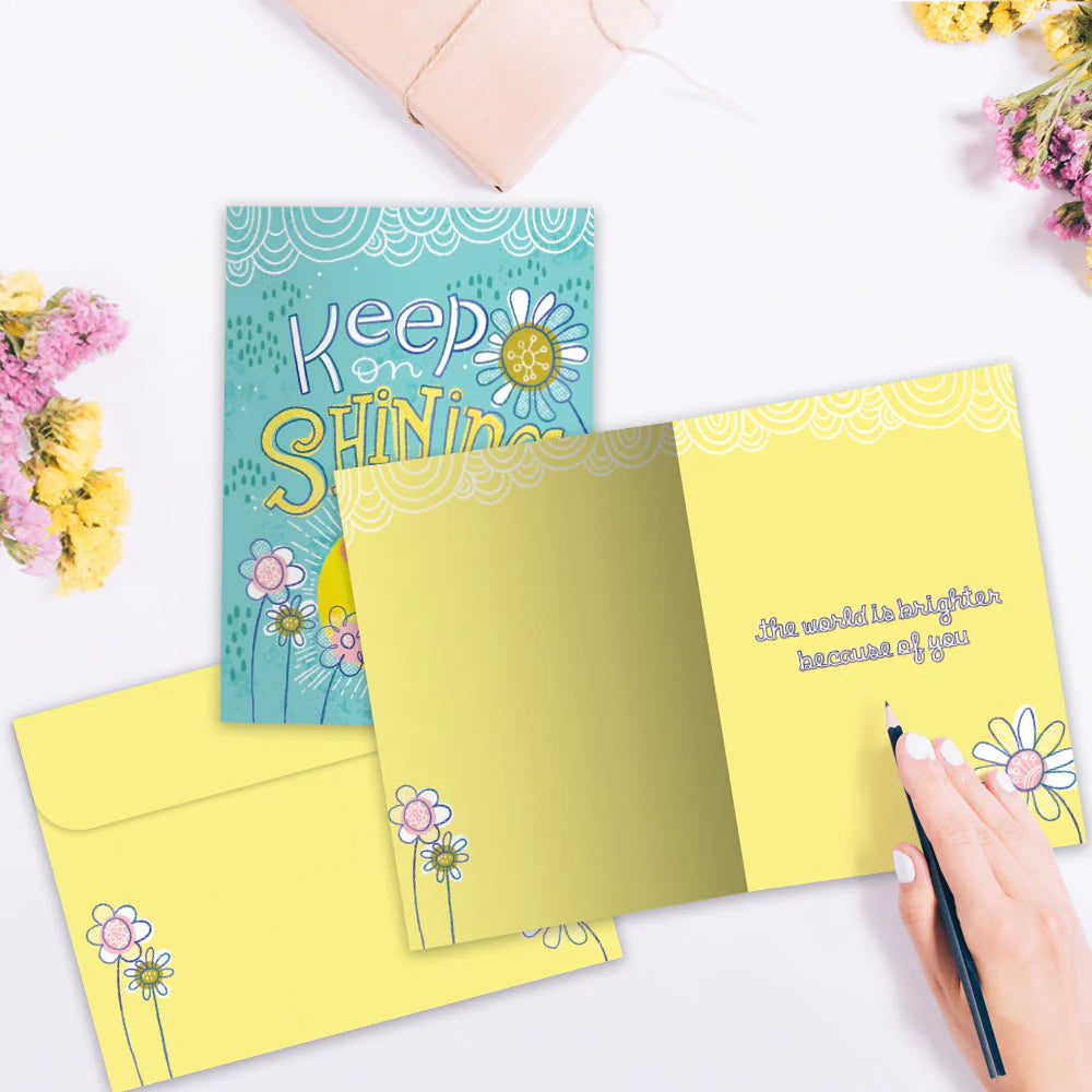 This 5 x 7 Just Because greeting card reads "Keep on shining" on the cover, and on the inside shares the message "The world is brighter because of you". It features art by Cynthia Frenette, includes a fully printed matching ARTvelope, and is made from 100% post-consumer recycled material. Tree-Free's printing processes are powered by solar energy and are proudly made in the USA.
