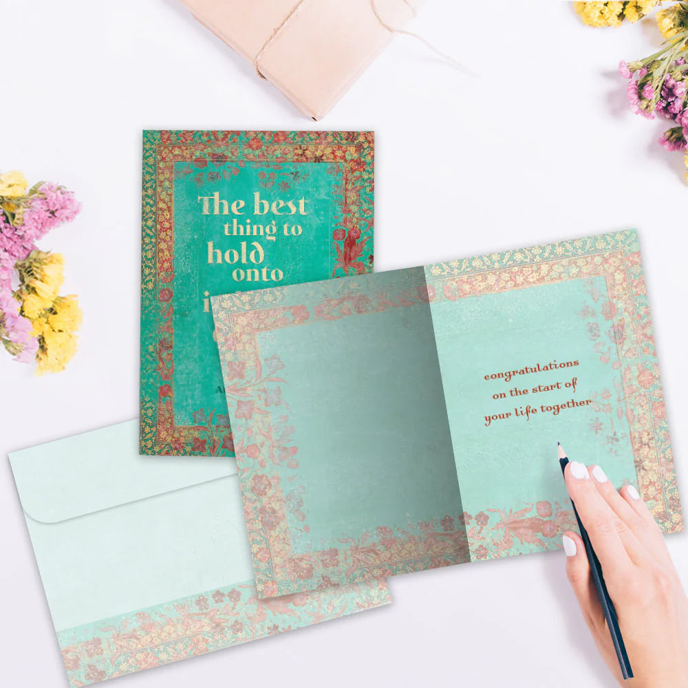 This 5 x 7 Wedding greeting card reads "The best thing to hold onto in life is each other. -Audrey Hepburn" on the cover, and on the inside shares the message "Congratulations on the start of your life together". It features art by Angi and Silas, includes a fully printed matching ARTvelope, and is made from 100% post-consumer recycled material. Tree-Free's printing processes are powered by solar energy and are proudly made in the USA.