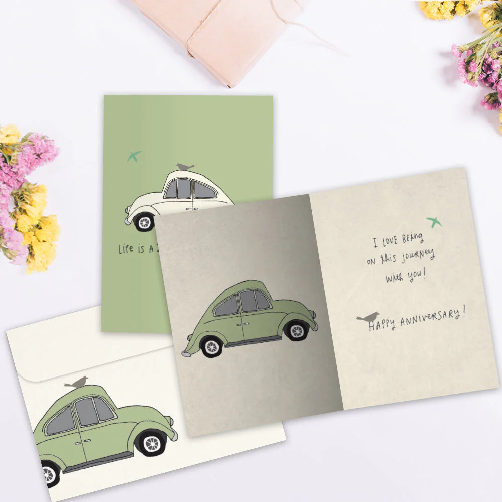 This 5 x 7 Anniversary greeting card reads "Life is a journey, not a destination" on the cover, and on the inside shares the message "I love being on this journey with you! Happy anniversary!". It features art by Susa Talan, includes a fully printed matching ARTvelope, and is made from 100% post-consumer recycled material. Tree-Free's printing processes are powered by solar energy and are proudly made in the USA.